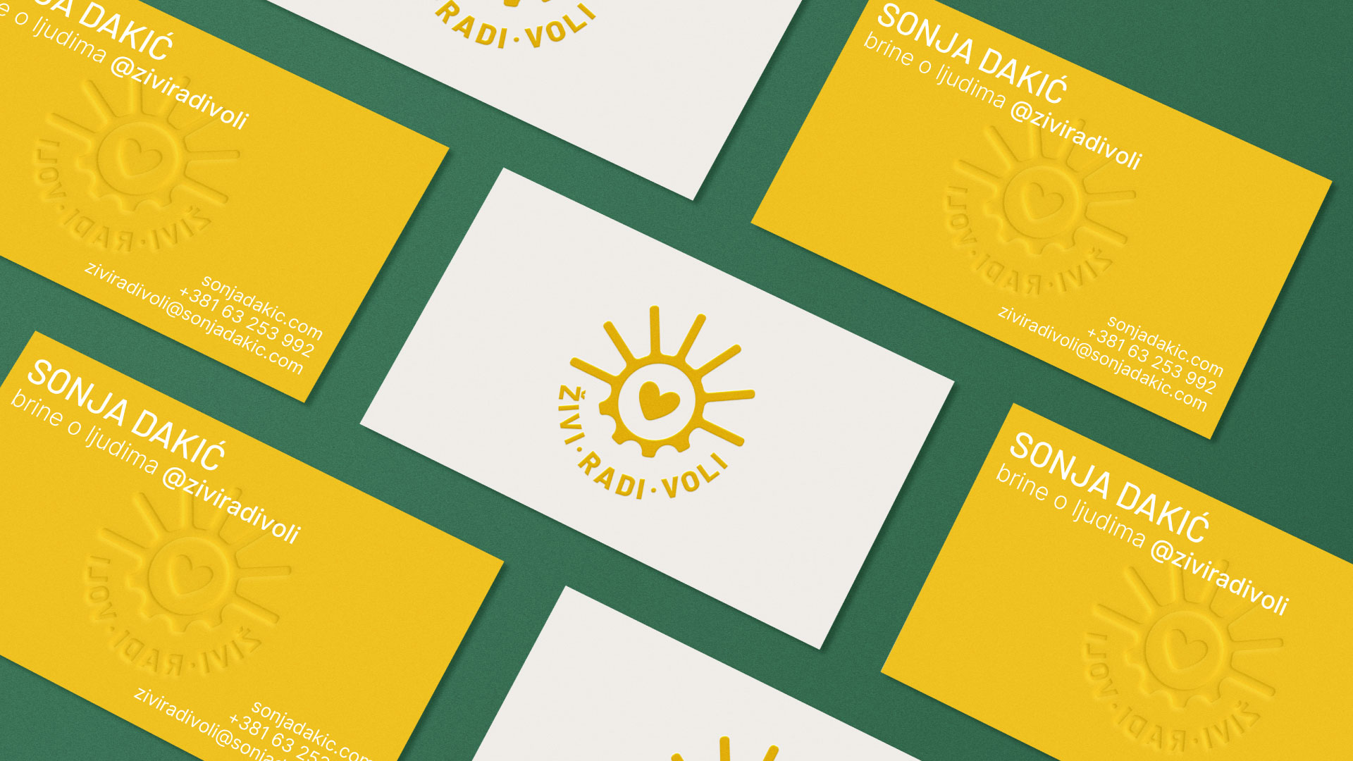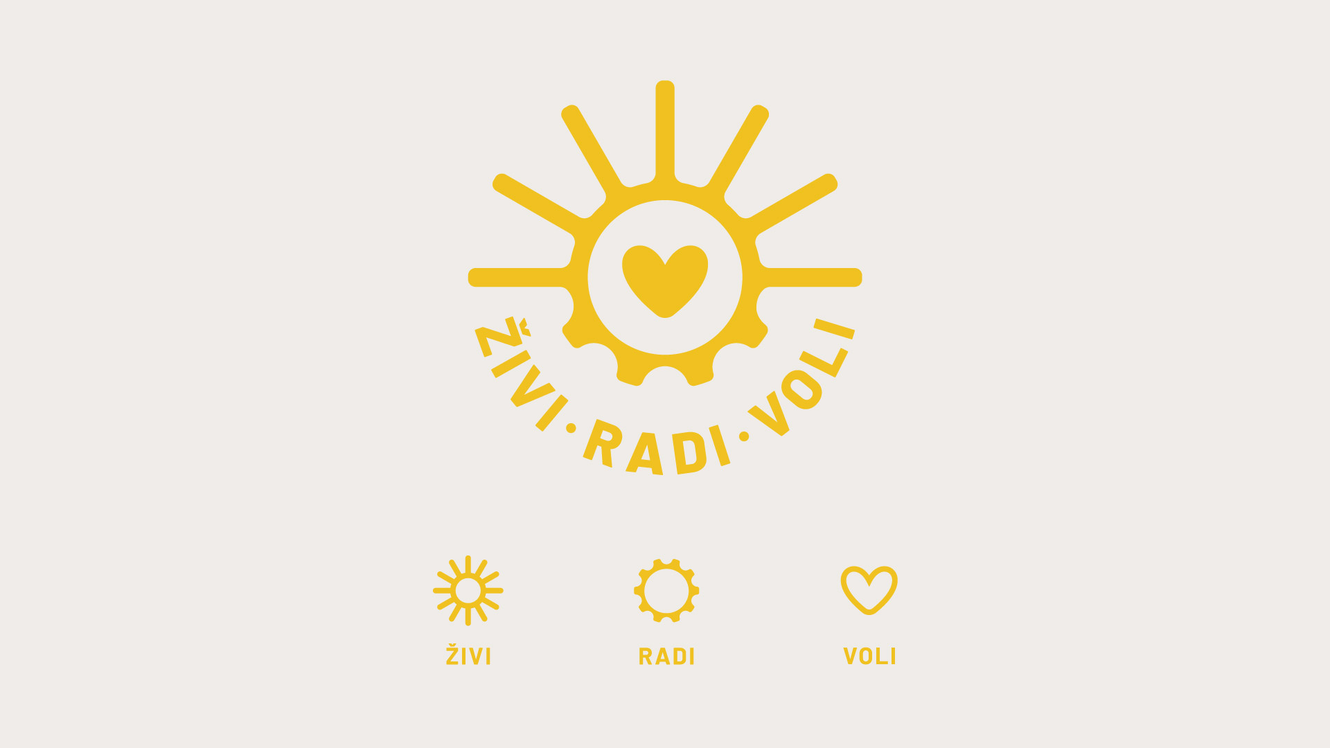 Ključne vrednosti iza Živi.Radi.Voli. brenda su zajednica, podrška, vera, ljubav i radost. Sonja je želela da se one oslikavaju u njenom vizuelnom identitetu. Logo je trebalo da bude jednostavan za primenu u jednoj boji, kao piktogram prepoznatljiv u malom formatu, lako primenljiv u brendiranju. Simbole iz naziva brenda trebalo je spojiti u jedan jedinstven i upečatljiv piktogram: ŽIVI – simbol je Sunce kao izvor života na zemlji, RADI – zupčanik koji (p)okreće, VOLI – srce za ljubav.