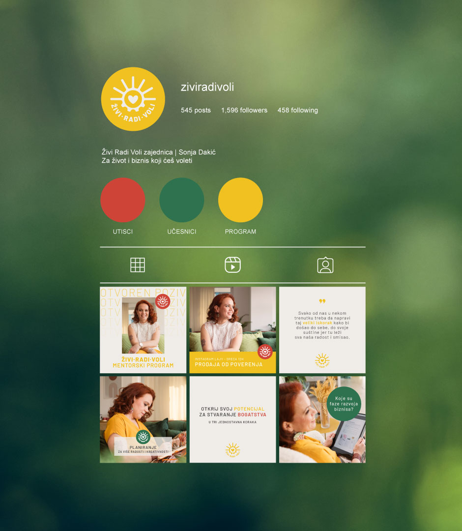 Moj preduzetnički put se najviše promenio kada sam upoznala Sonju Dakić, ženu sunce, velikog srca koja nesebično deli svoje ogromno znanje kroz različite radionice i programe. Sonja je stvorila Živi.Radi.Voli. zajednicu u kojoj pomaže preduzetnicama da njihove ideje porastu. Velika mi je čast što mi je poklonila poverenje da za zajednicu kreiramo novi vizuelni identitet koji je oslikava na pravi način.